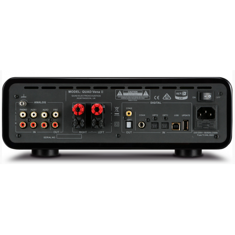В дополнение к двум линейным входам усилитель получил качественный встроенный фонокорректор для MM-звукоснимателей. Таким образом, владельцам проигрывателей винила не придется использовать совместно с Quad Vena II внешний корректор. Аппарат получил и новый встроенный ЦАП на микросхеме ES9018K2M, сигнал на который может быть подан с оптических, коаксиального или USB-входов. Поддерживается обработка цифровых сигналов с параметрами до 32 бит / 384 кГц (PCM), а также DSD256. Еще одной существенной доработкой в модели Quad Vena II является выход на наушники. Теперь он реализован на отдельной схеме, за счет чего появилась возможность подключения наушников с любым стандартным значением импеданса.