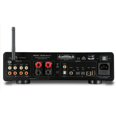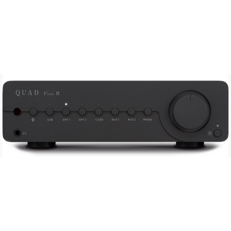 В дополнение к двум линейным входам усилитель получил качественный встроенный фонокорректор для MM-звукоснимателей. Таким образом, владельцам проигрывателей винила не придется использовать совместно с Quad Vena II внешний корректор. Аппарат получил и новый встроенный ЦАП на микросхеме ES9018K2M, сигнал на который может быть подан с оптических, коаксиального или USB-входов. Поддерживается обработка цифровых сигналов с параметрами до 32 бит / 384 кГц (PCM), а также DSD256. Еще одной существенной доработкой в модели Quad Vena II является выход на наушники. Теперь он реализован на отдельной схеме, за счет чего появилась возможность подключения наушников с любым стандартным значением импеданса.