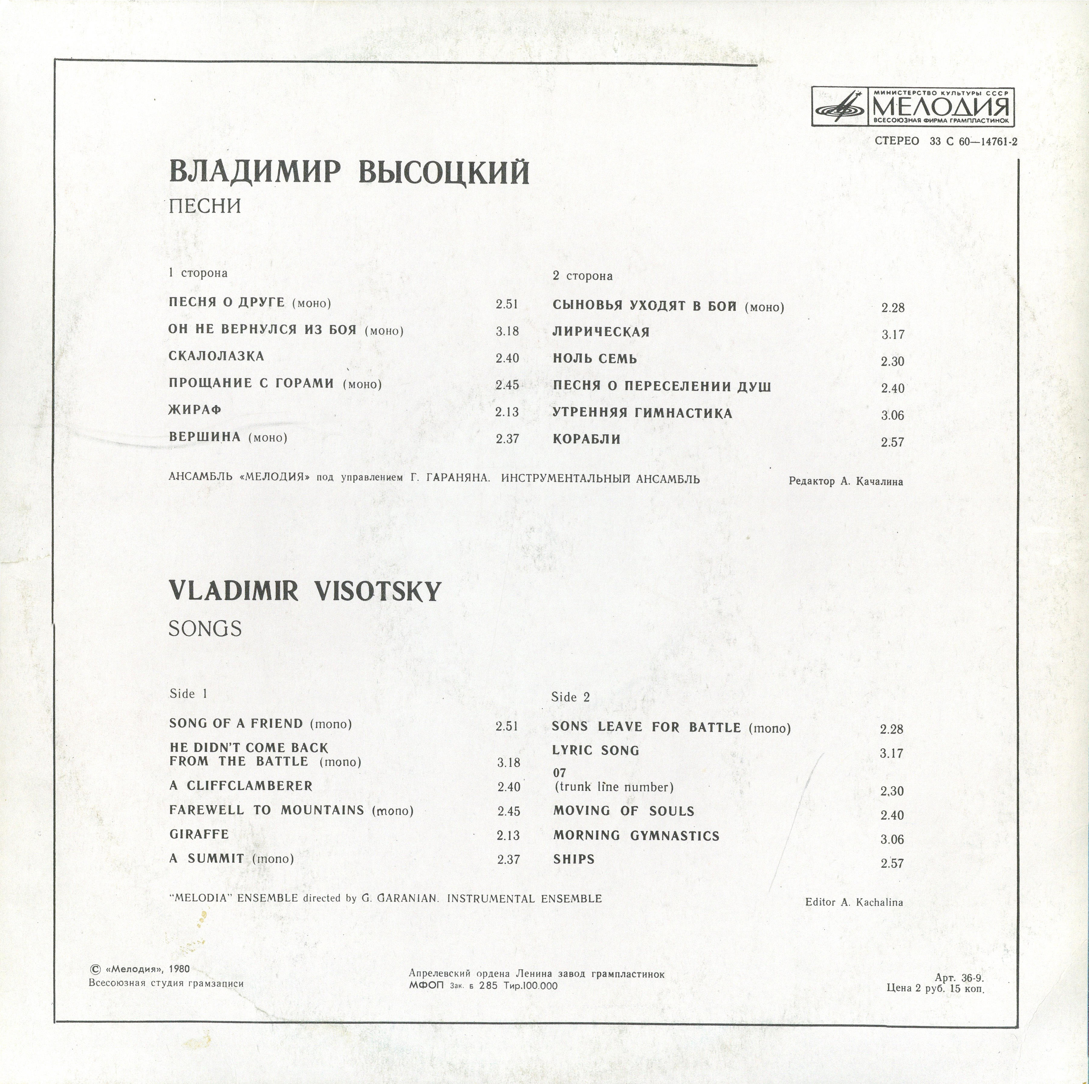 Виниловая пластинка Владимир Высоцкий - Песни (Мелодия) (LP)